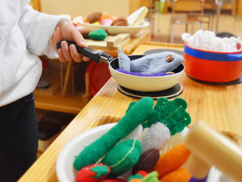 子どもたちは遊びの中でいろいろなことを学び、心身共に発達します。「じぶん」で選ぶことで、より意欲的に想像力を働かせながら遊びます。 室内には厳選した遊具を常に選べるよう置いています。また、心と体の発達によいとされるわらべうたも取り入れています。 もちろん戸外でも思い切り体を動かして遊びます。